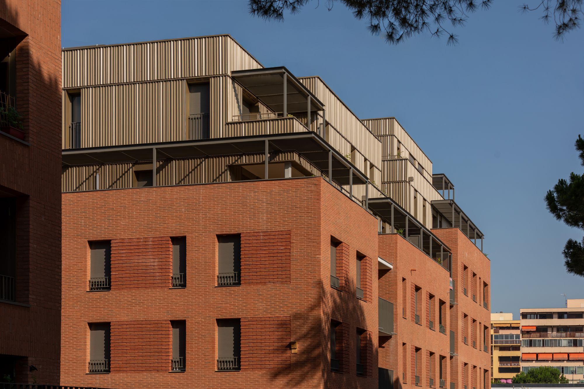 Chaque logement bénéficie d’espaces extérieurs généreux. Le socle dont la massivité est exprimée par la brique trouve