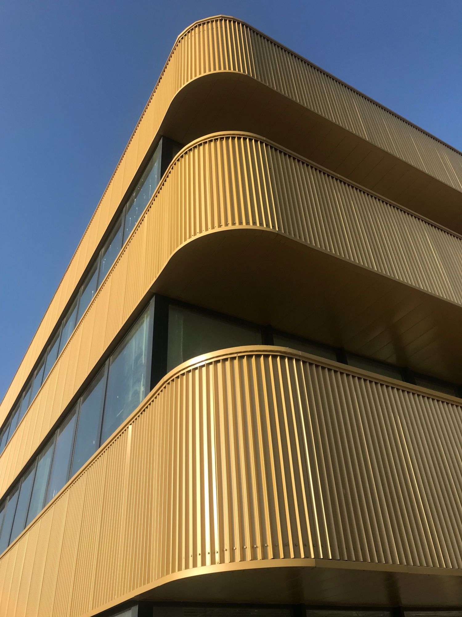 The vertical development of the building is formed of large superimposed slabs whose external extensions draw large terraces, with variable span and alignment. These terraces offer a privileged visual relationship with the sea, due west to Marseille, with a game of polarized light at sunset, which plays with the golden colored cladding. The color of the cladding helps AZUREA blend into its landscape. Finally, the building proposes to play on the variation of ambiences, colors and lights according to the hours of the day: soft light in the morning, more prominent light at midday and a wide palette of gradations at the end of the day.