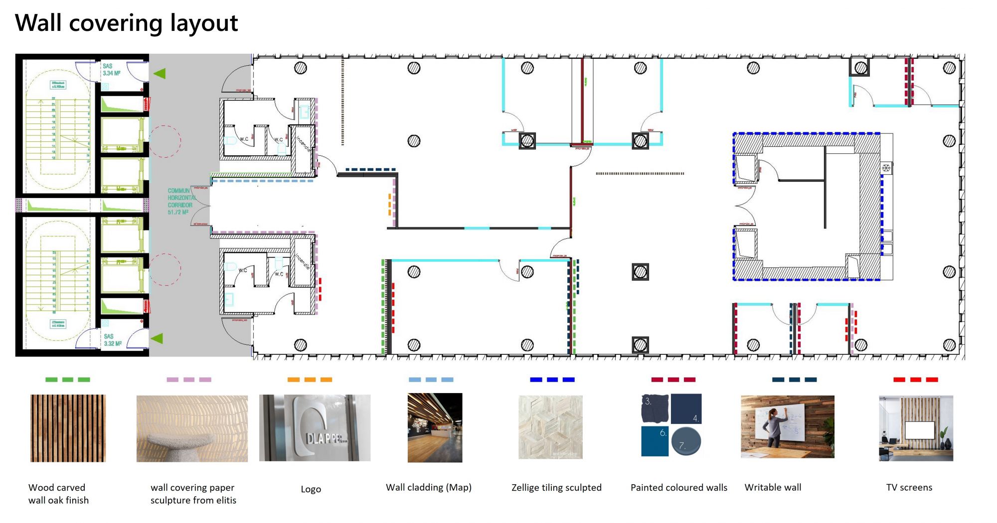 La palette de couleurs s'inspire de l'ADN général de DLA Piper traduit dans leurs bureaux, apportant transparence, confort et une ambiance smart. Les différentes textures proposées sont une façon d'imiter les barrières de façade extérieures et une solution pour apporter l'aspect culturel à travers le design.