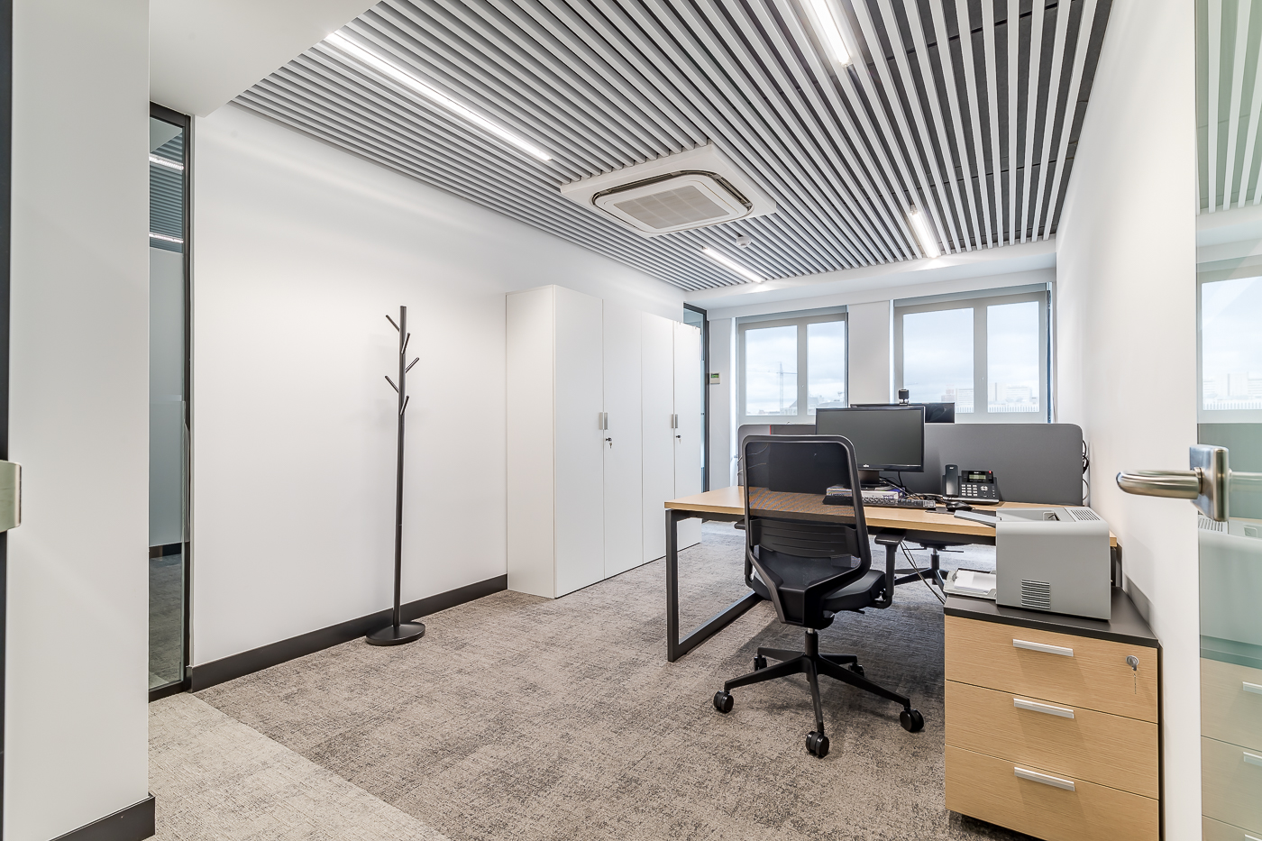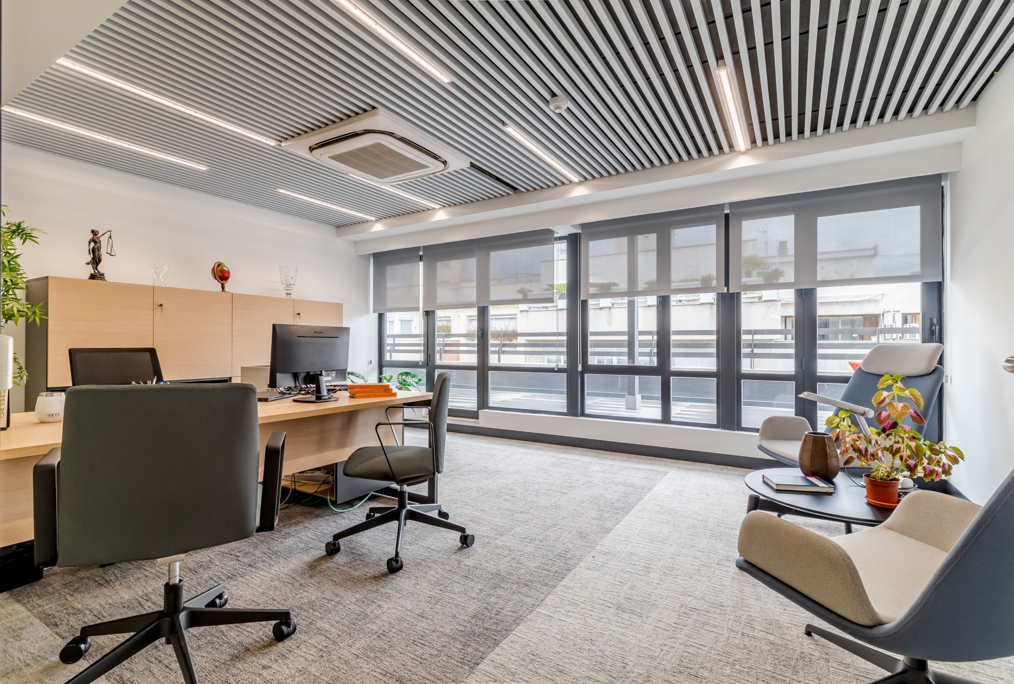 Pour créer une ambiance chaleureuse et élégante, une palette de couleurs a été choisie, combinant des tons tans et gris dans la moquette et le bois naturel, contrastant avec le profil noir des cloisons. Le mobilier de conception classique a ajouté une touche de sophistication, tandis que le plafond moderne à lamelles a non seulement apporté un aspect contemporain, mais aussi un éclairage contrôlé par le matériel, ce qui a permis d'optimiser la consommation d'énergie.Des capteurs individuels intégrés assurent une plus grande praticité et un meilleur confort pour tous les occupants.